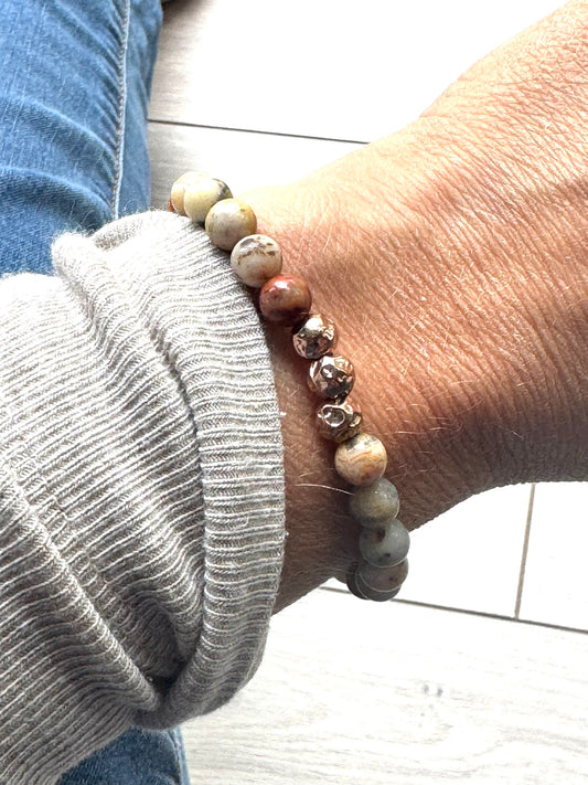 Natural Agate Gemstone Bracelet with Rose Gold Textured Beads | Handmade in the UK