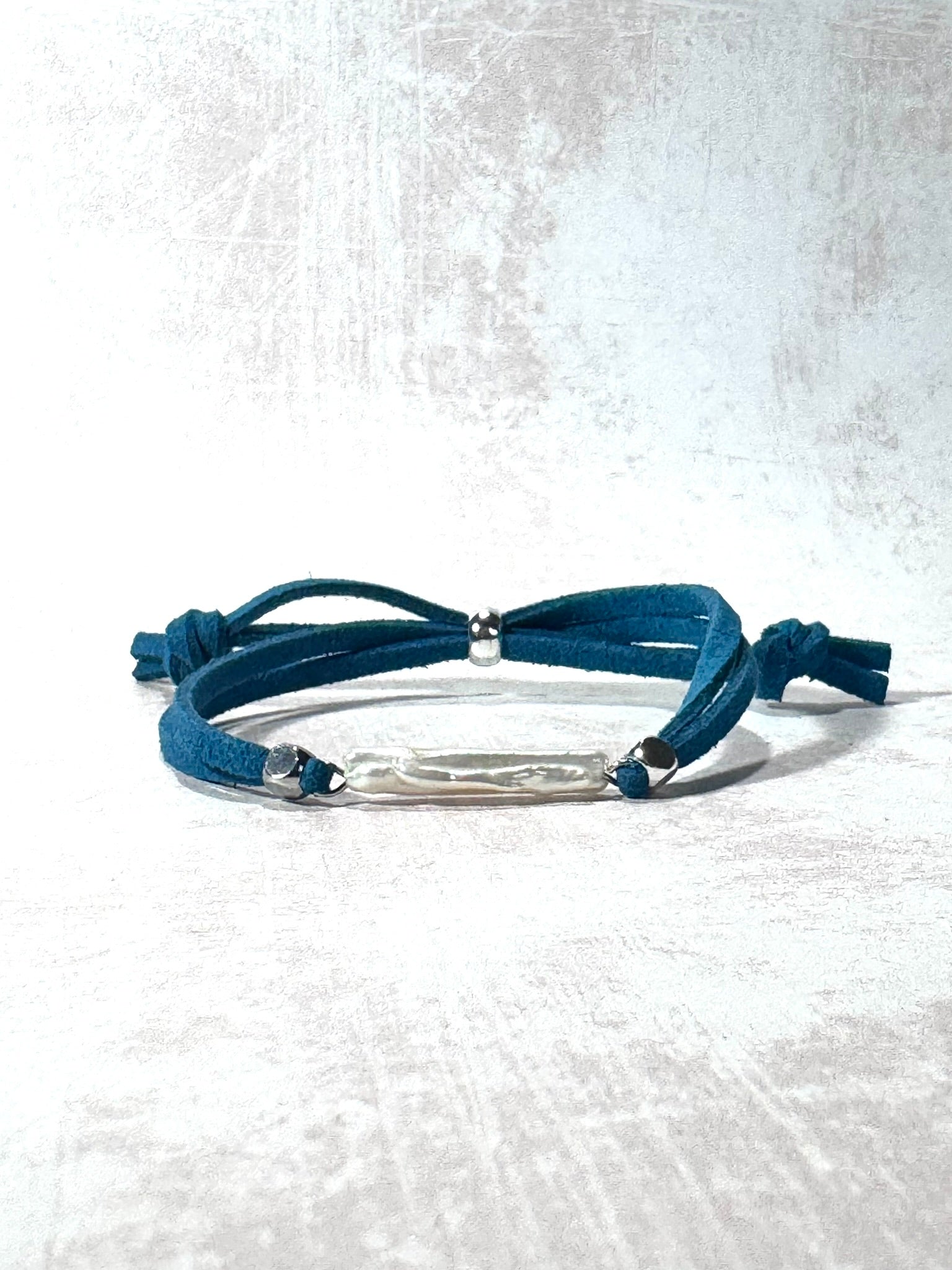 This minimalist bracelet features a natural freshwater pearl bar (approx. 20mm) set on soft teal faux suede. The adjustable design fits wrist sizes from 5.5 to 8 inches with a secure sliding bead.