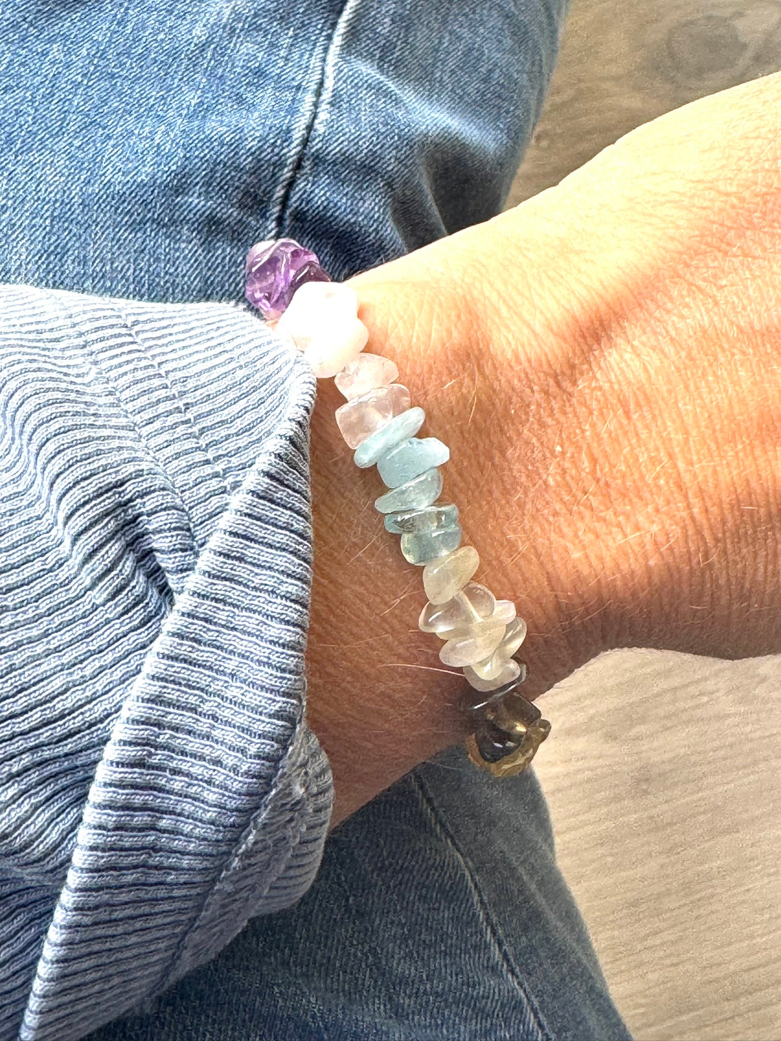 A softer, subtle take on the classic chakra bracelet featuring natural 4–6mm nugget beads of amethyst, rose quartz, aquamarine, citrine, smoky quartz, moonstone, and clear quartz. Covering all 7 charkras. Finished with a stainless steel lobster clasp and extender chain that is hypoallergenic, waterproof, and anti-tarnish for everyday wear.