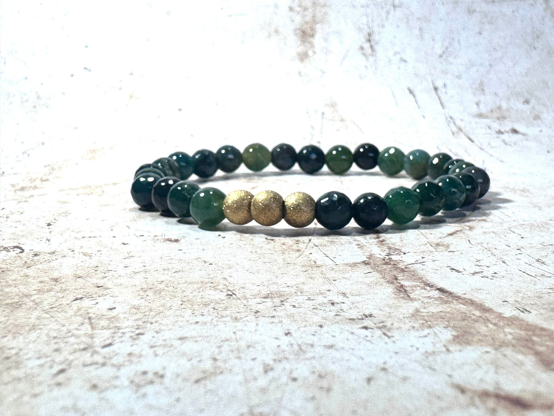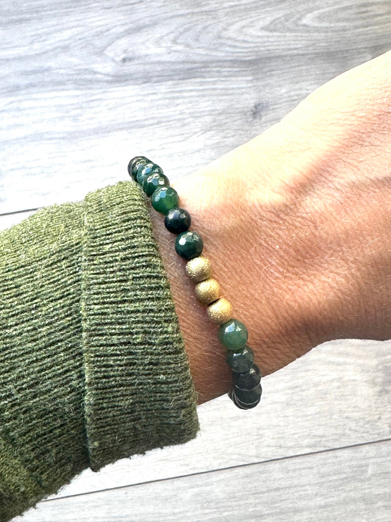This bracelet features natural 6mm faceted green moss agate beads accented with three textured gold stainless steel beads. Strung on high-quality elastic for durability and comfort.