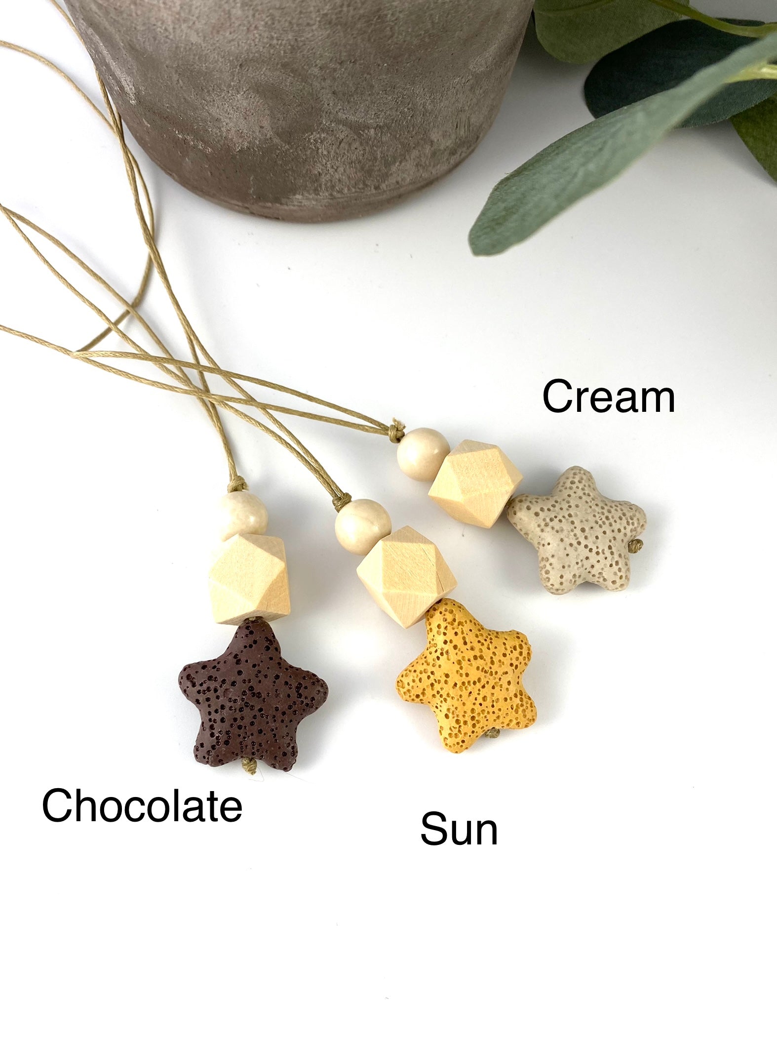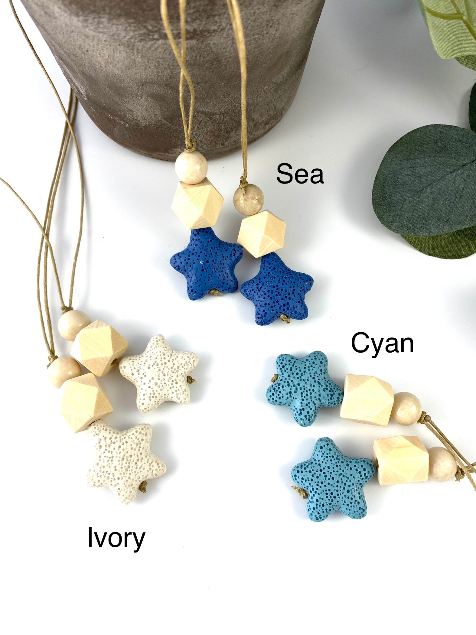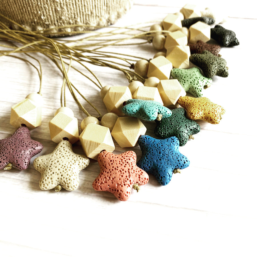 Lava Stars, handmade with a fossilised crystal bead and a beech wood bead.