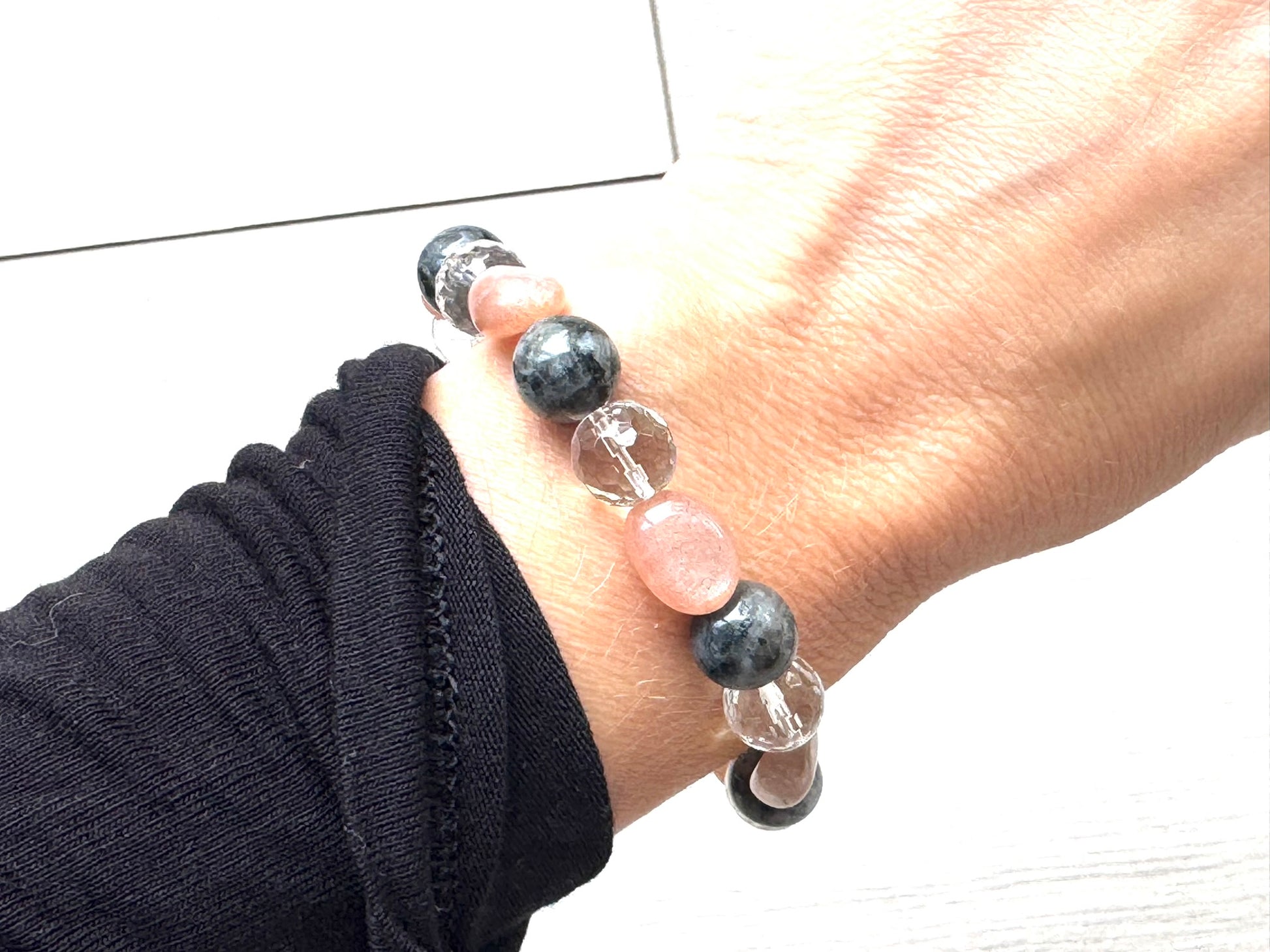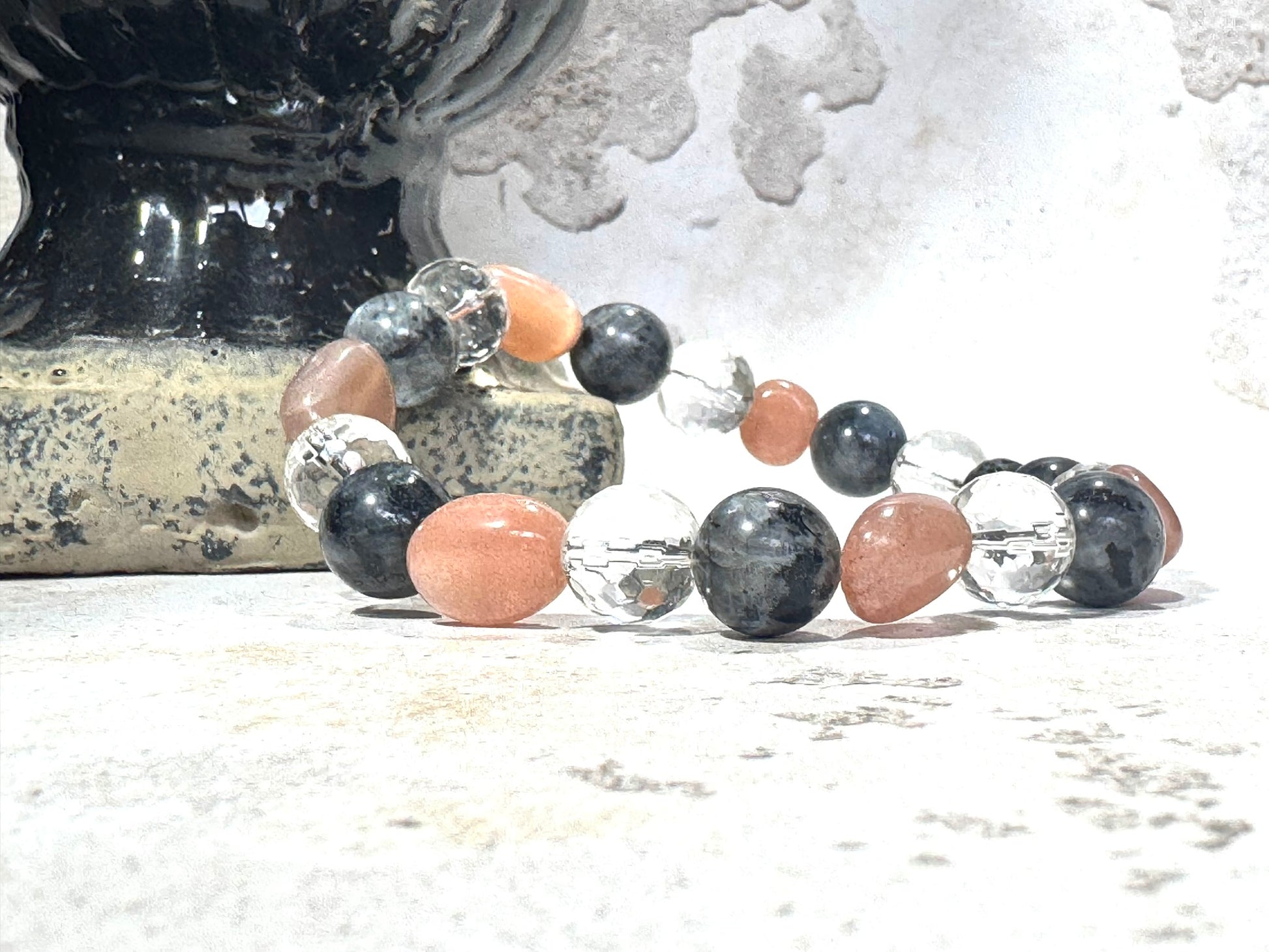 Bold, grounding, and full of natural energy – this chunky 10mm gemstone bracelet is a powerful statement piece crafted with intention and style. Featuring a striking combination of clear quartz beads, sleek metallic anthracite, and warm, shimmering sunstone nuggets, it offers a unique mix of clarity, strength, and vitality.
