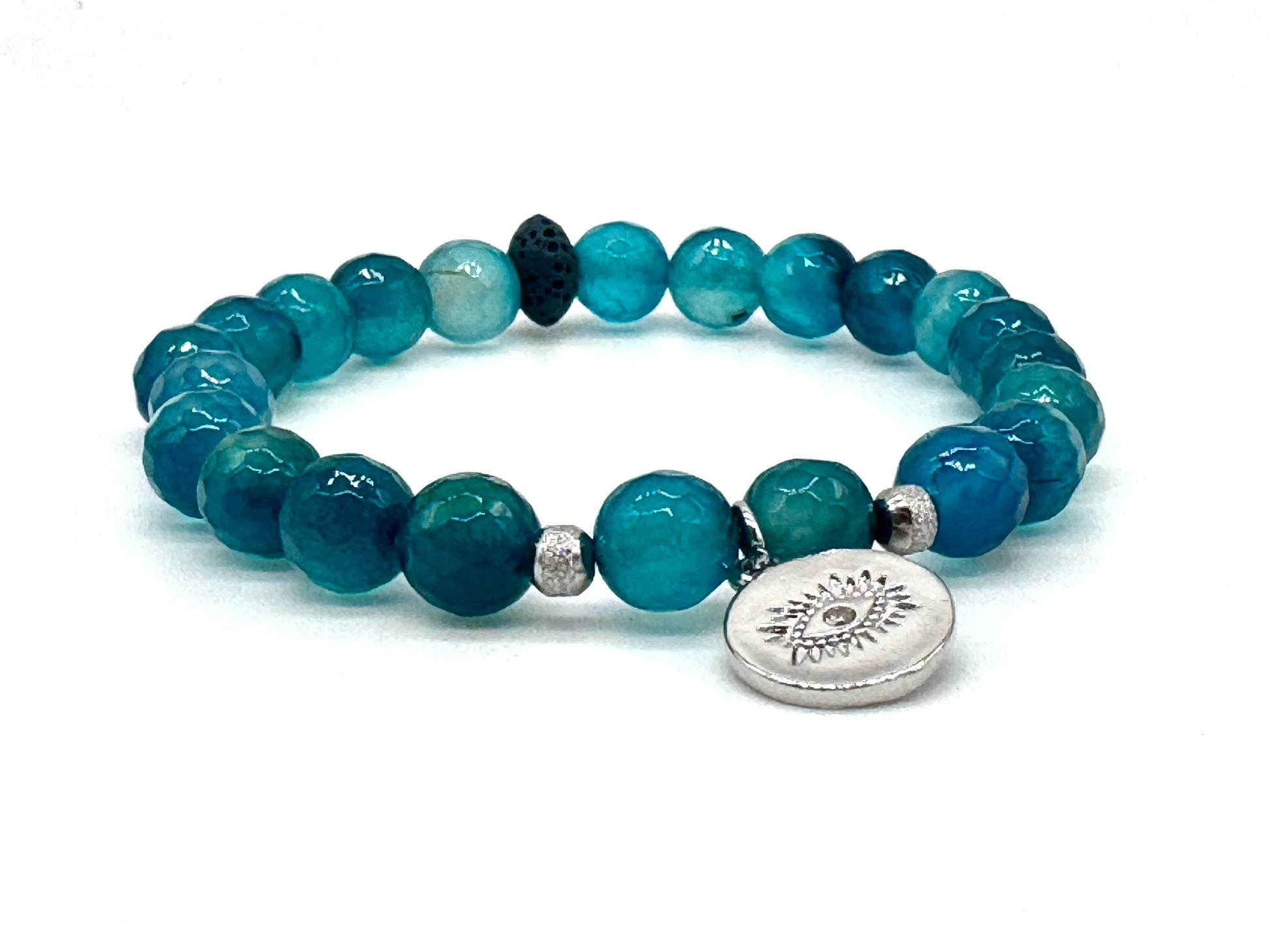 This bracelet features 8mm heat-dyed teal agate beads with a silver-tone evil eye charm for added protection. Includes a lava stone bead for optional use with essential oils.