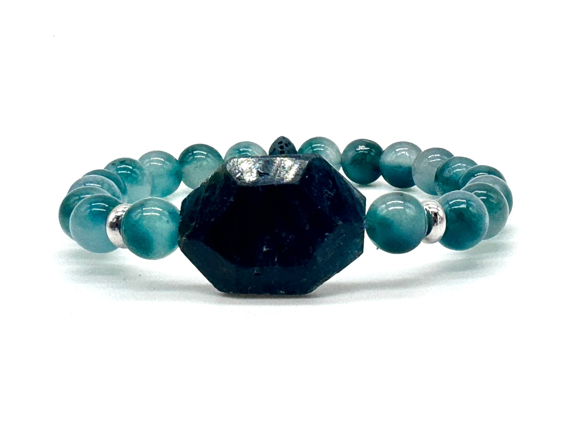 This natural apatite bracelet features a bold 20mm apatite focal stone, paired with 8mm teal glass beads. A lava stone bead allows you to add essential oils for optional aromatherapy.