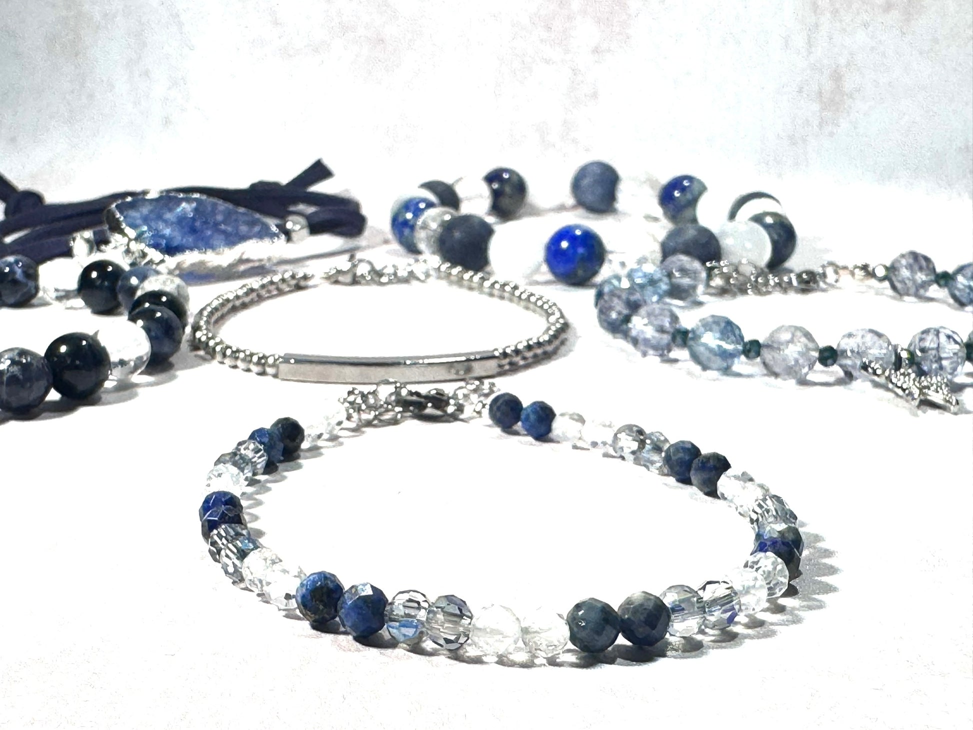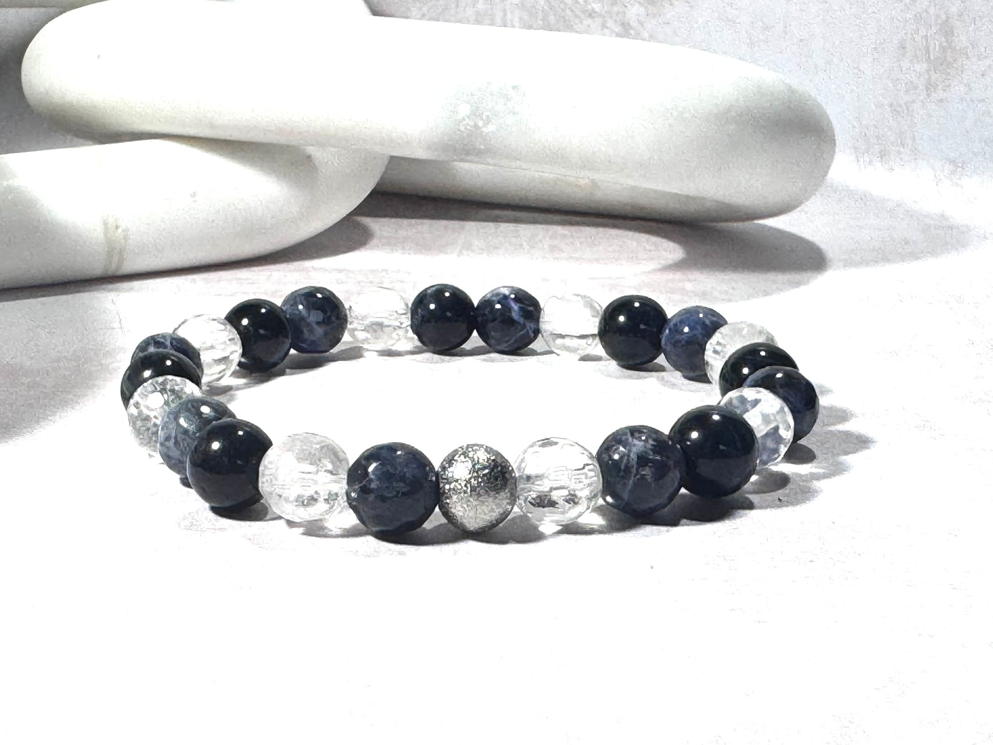 Grounded in meaning and crafted with care, this 8mm gemstone bracelet combines a stunning mix of faceted sodalite, deep navy tiger’s eye, and clear quartz beads, finished with a single textured stainless steel silver bead for a modern, polished look.