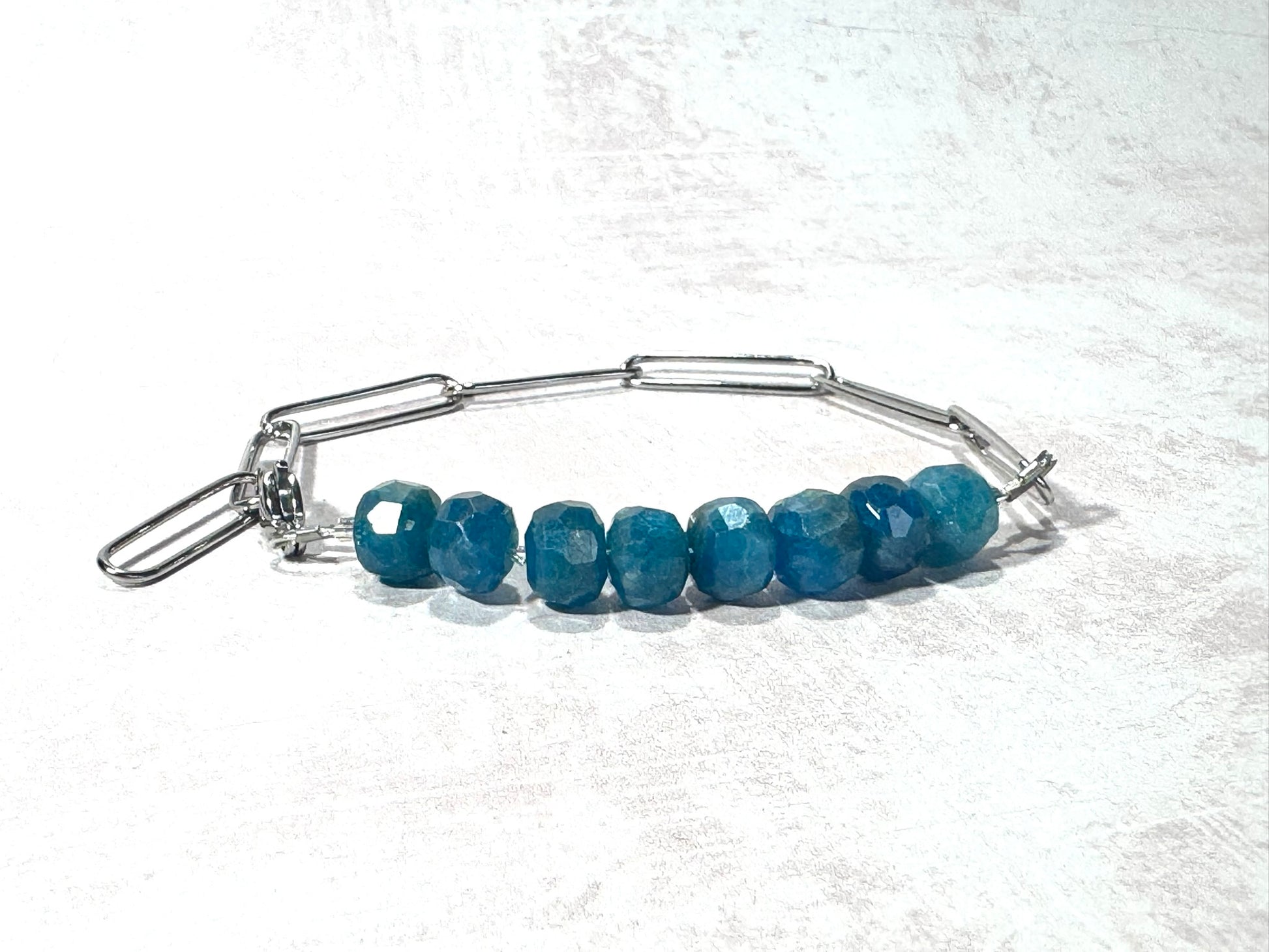 This bracelet combines natural 8mm apatite gemstone beads with a bold silver paperclip chain made from stainless steel. Hypoallergenic, waterproof, and anti-tarnish for long-lasting wear. Adjustable length from 6 to 7.5 inches with a secure clasp.