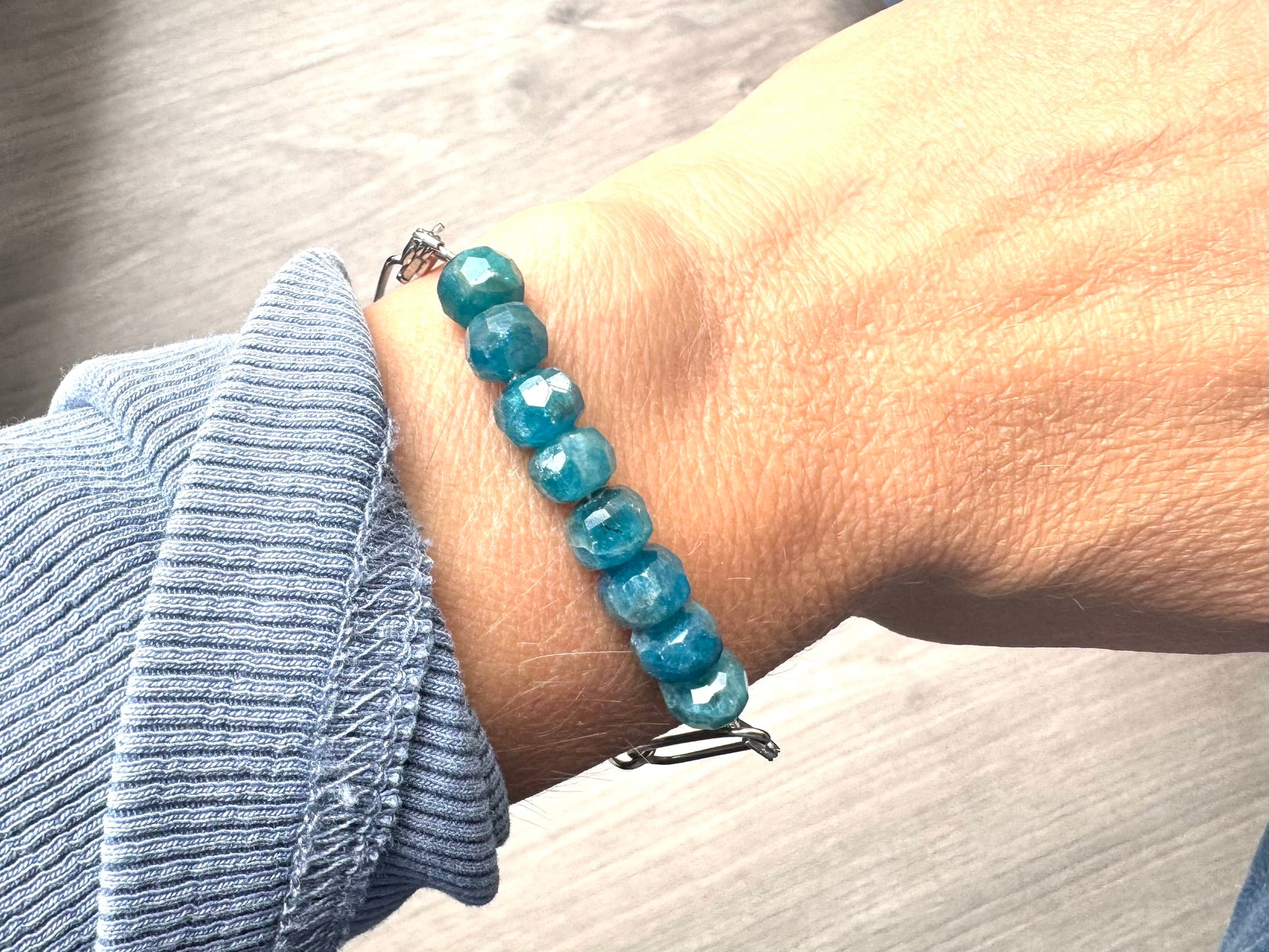 Each bracelet is unique due to the natural variation in apatite stone colour and pattern.