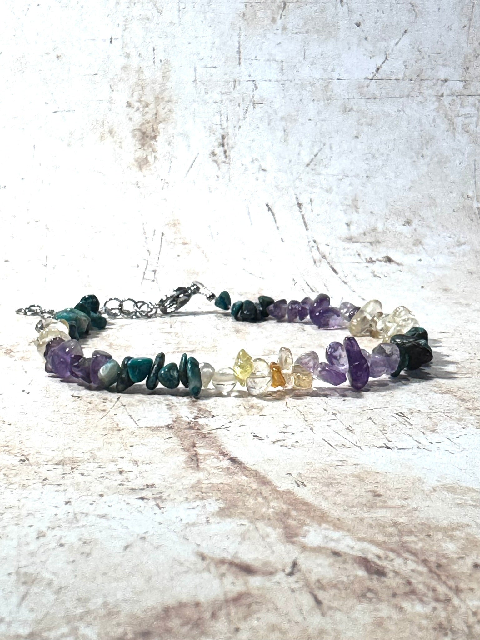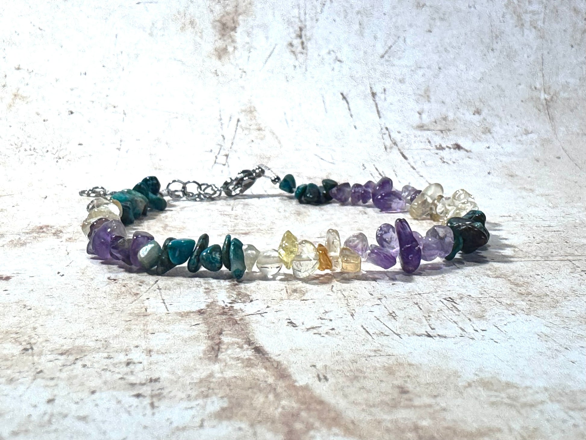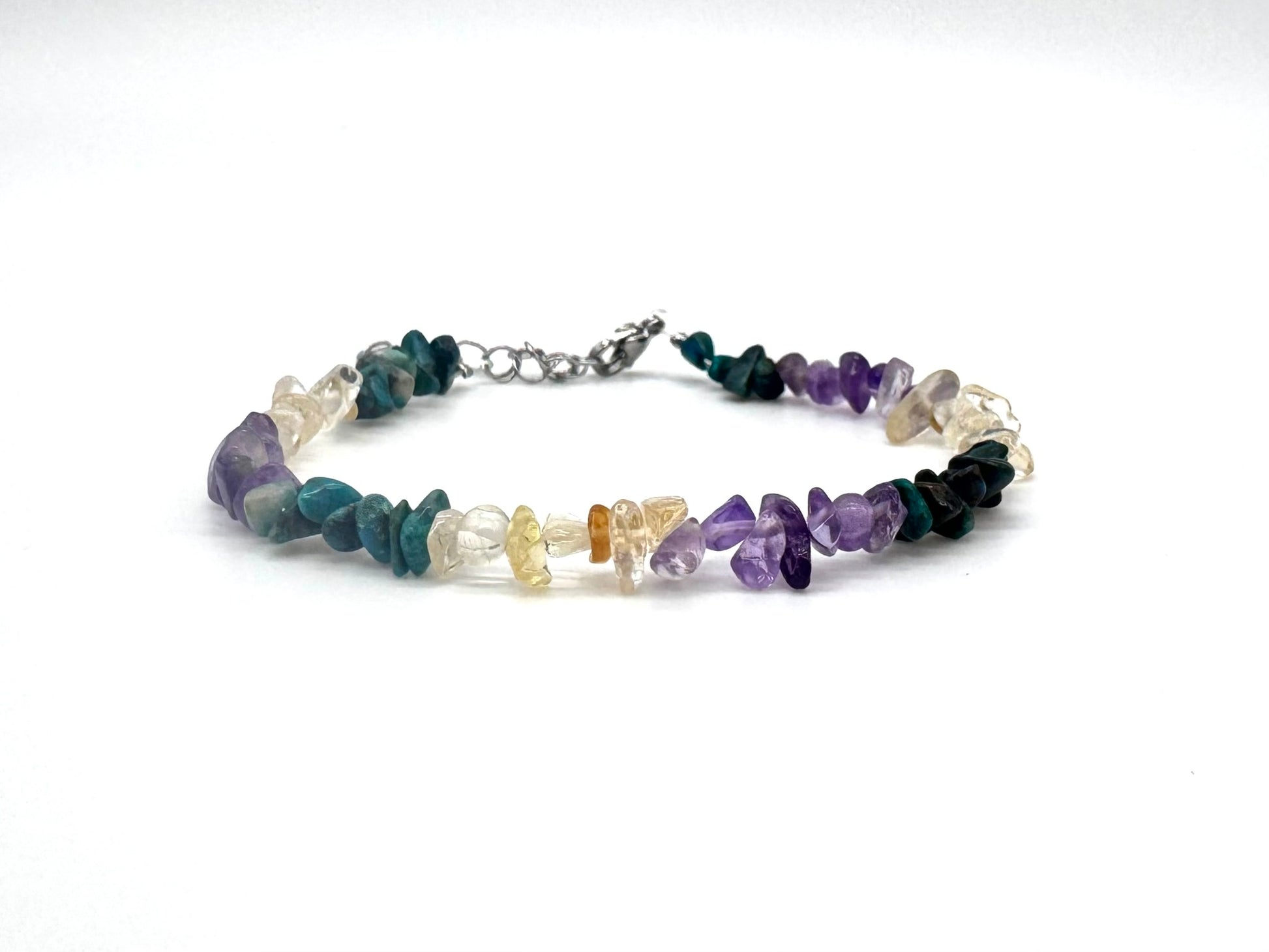 This delicate bracelet features small 5–6mm nugget beads of natural citrine, amethyst, and apatite, expertly strung on high-quality wire. Finished with a gold stainless steel lobster clasp and extender chain that is anti-tarnish for lasting shine and durability.