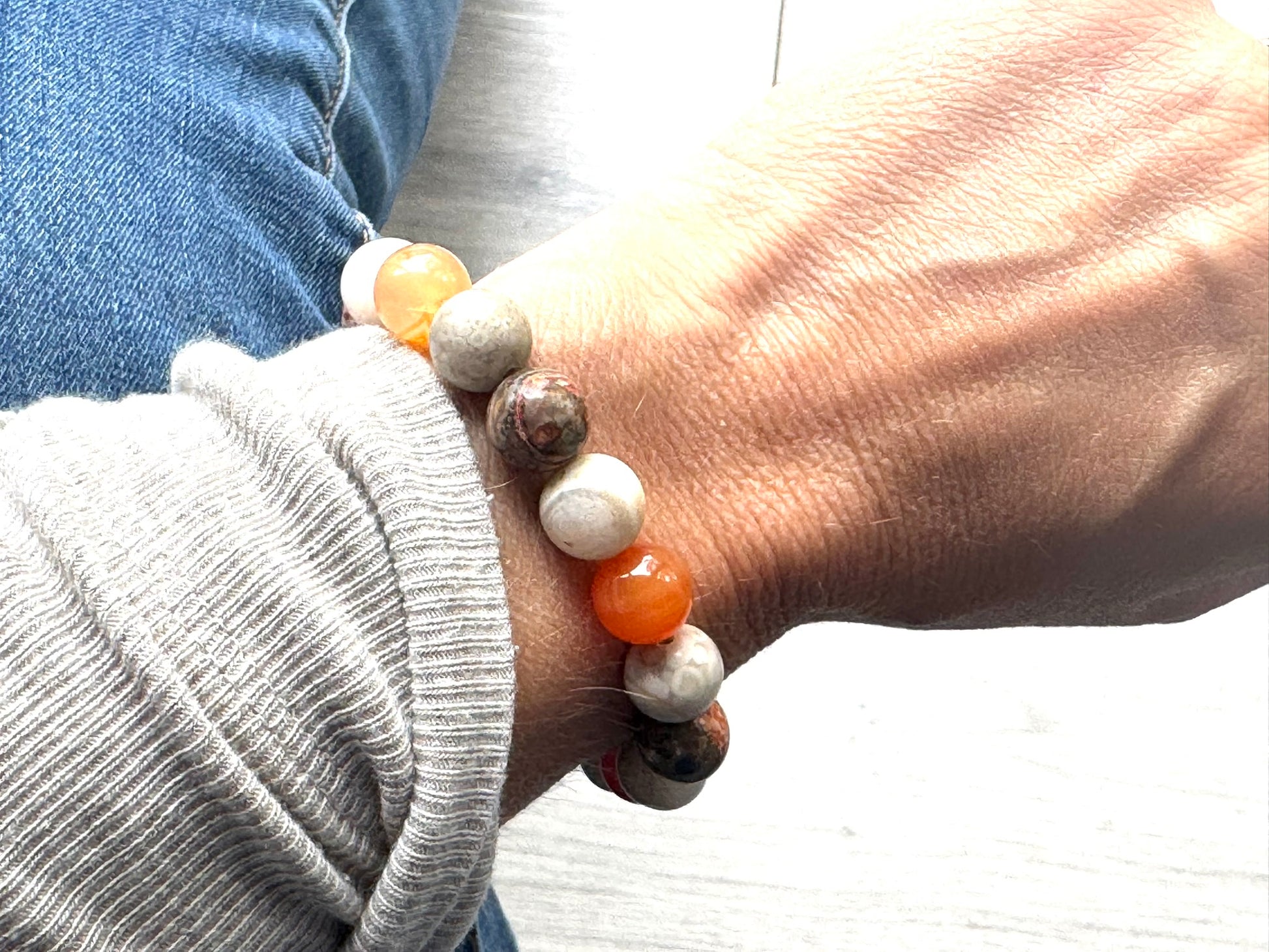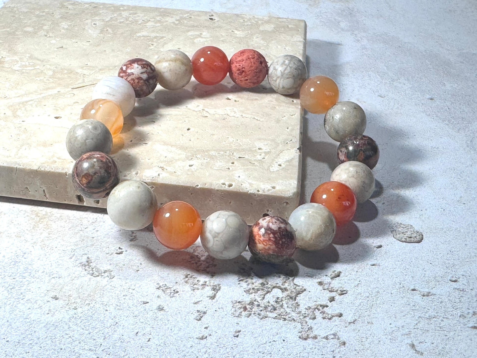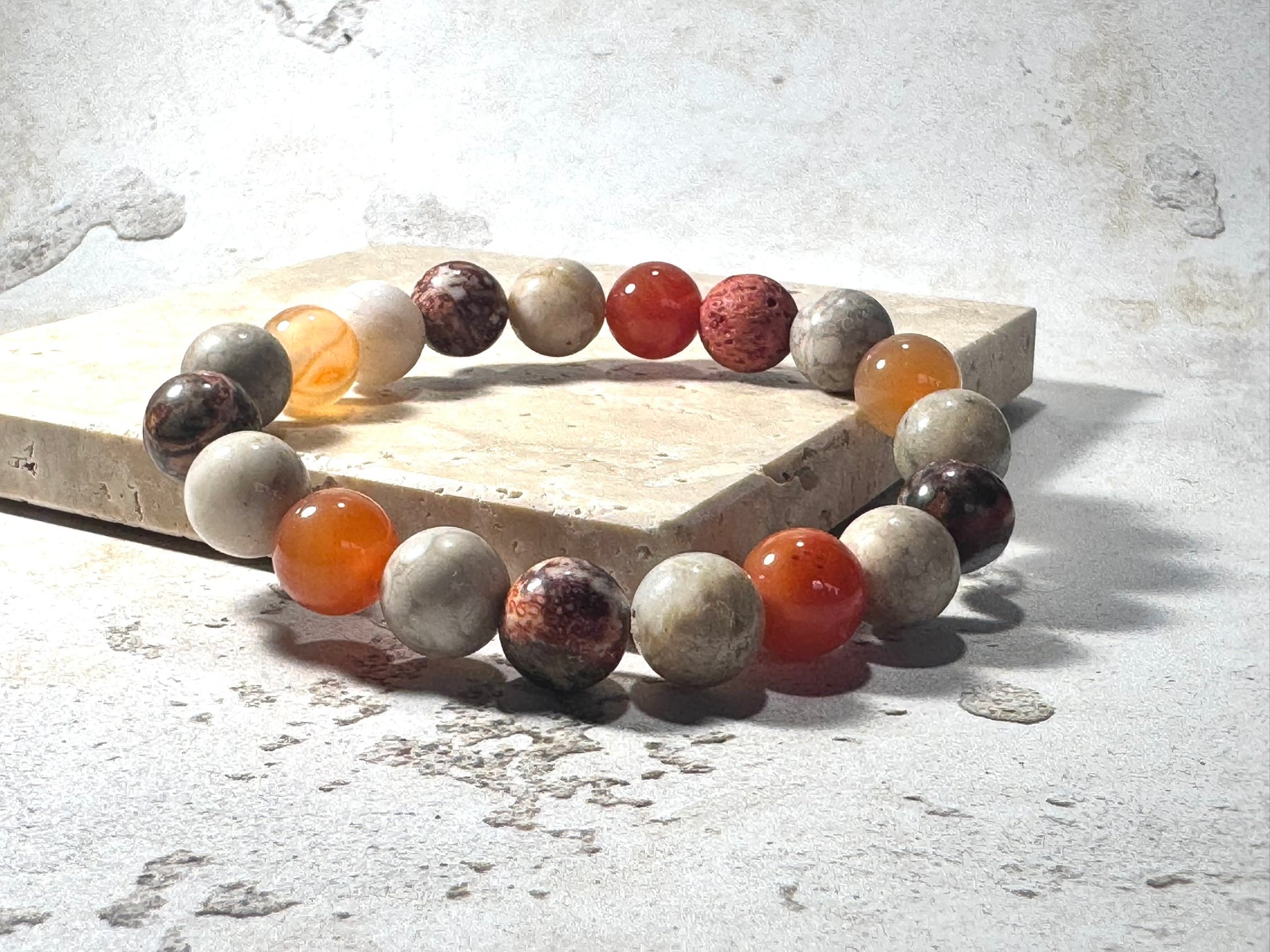 Our handmade gemstone bracelet brings together a combination of chrysanthemum agate, carnelian, and jasper beads in rich dark orange and earthy natural tones. Each 10mm bead is completely natural, offering a striking mix of colour, pattern, and energy.