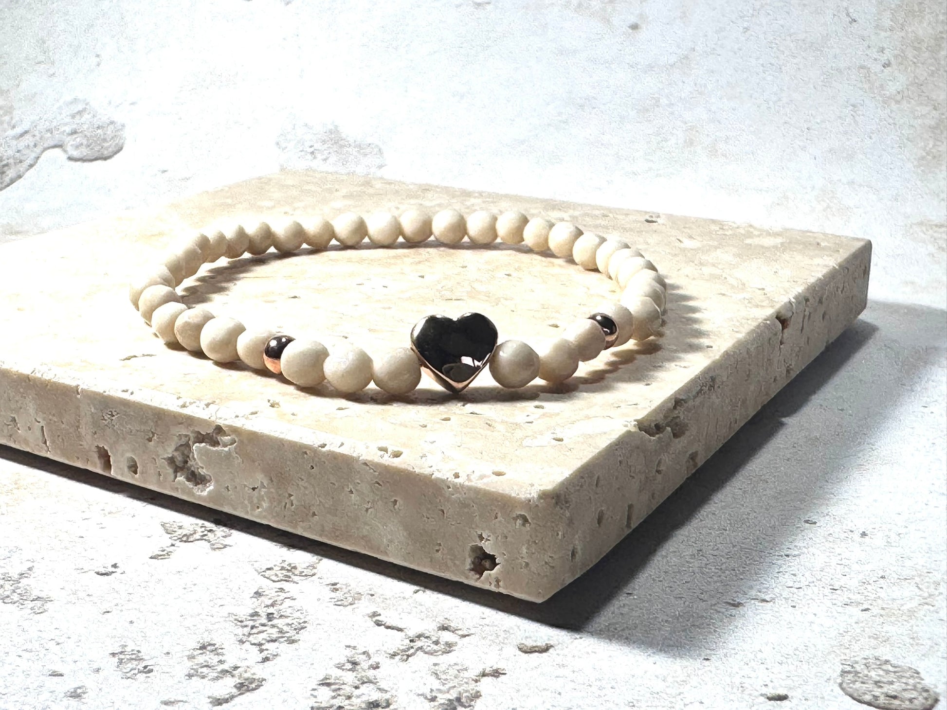 Fossilised Wood Gemstone Bracelet – Cream with Rose Gold Heart Charm | Handmade in the UK